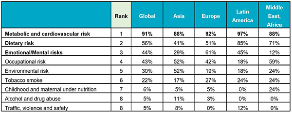 Globally, the top three health risk factors influencing medical cost remain metabolic and cardiovascular risk, dietary risk and emotional/mental risk. On a regional level, there is variation in the top risk factors (see also Table 1):